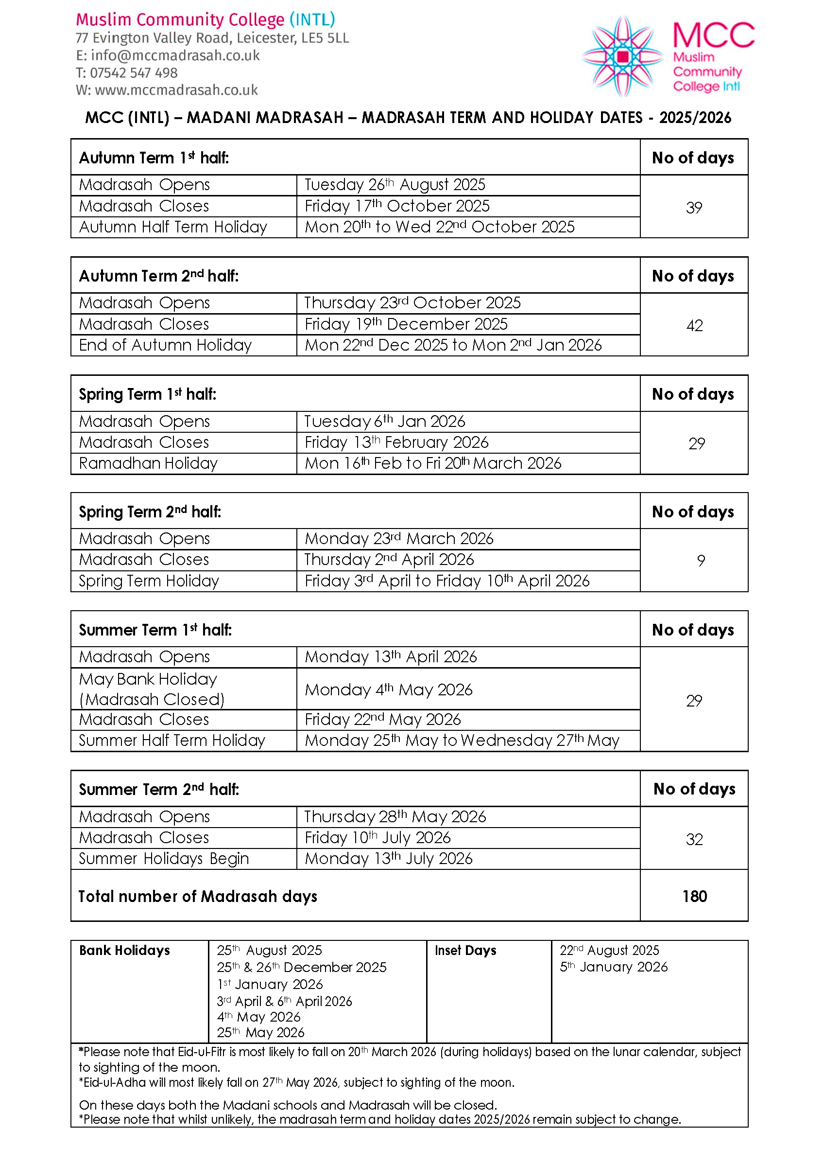 A polite reminder for parents to ensure that these term dates are taken into consideration when planning your family holidays.